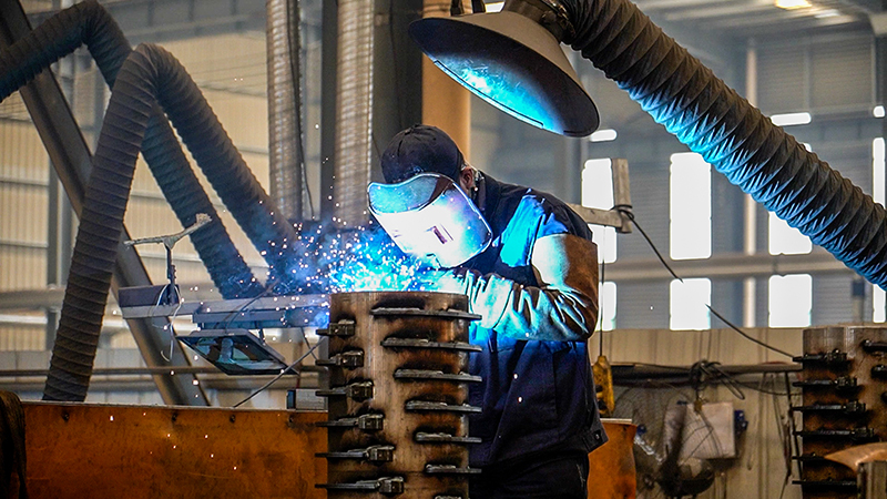 焊接區(qū)內(nèi),焊工正在專注作業(yè),藍(lán)色的焊接弧光此起彼伏,老師傅們手法嫻熟,每條焊縫都均勻美觀。