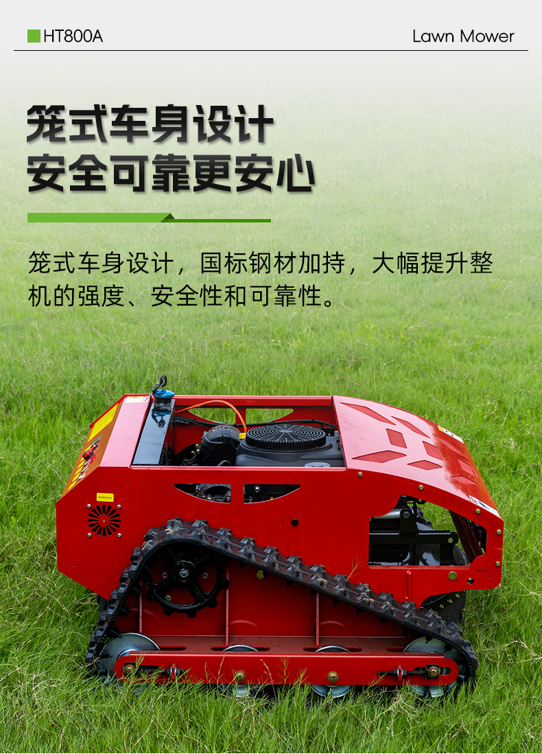 HT800A遙控割草機(jī)籠式車身設(shè)計(jì),國(guó)標(biāo)鋼材加持,大幅提升整機(jī)的強(qiáng)度、安全性和可靠性。