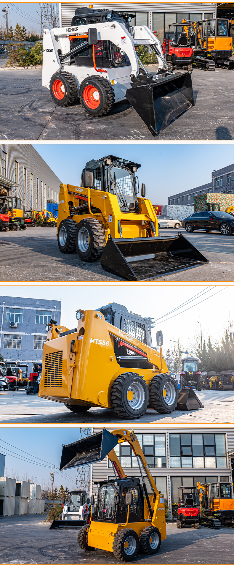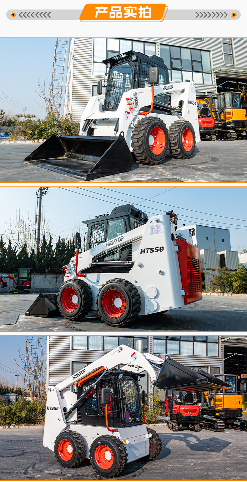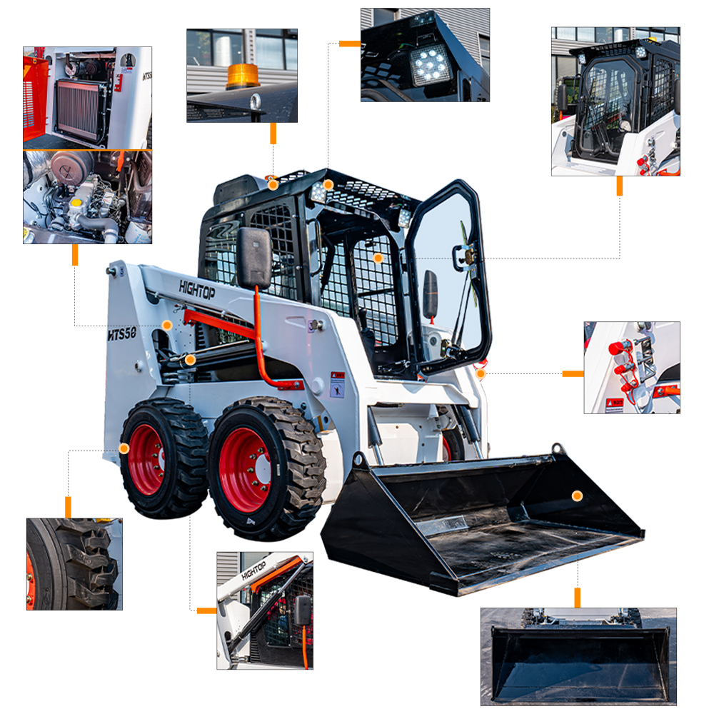 HTS50滑移裝載機(jī)配備快換裝置、安全自鎖裝置、大臂支撐裝置、降噪海綿、前液壓輔助裝置、倒車警報(bào)及喇叭等多重功能配置。